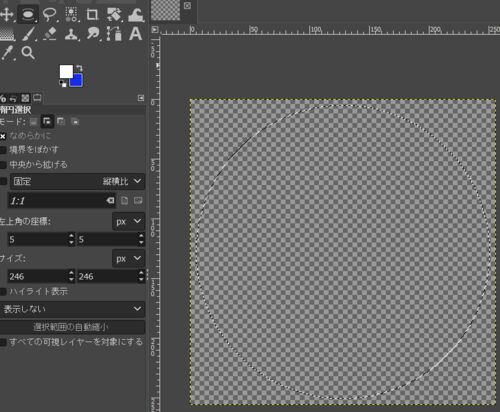 楕円選択で正円に選択。 グラデーションが入ったブラシで選択範囲の外側に沿って塗る。 消しゴムで適当に消していく。 完成。